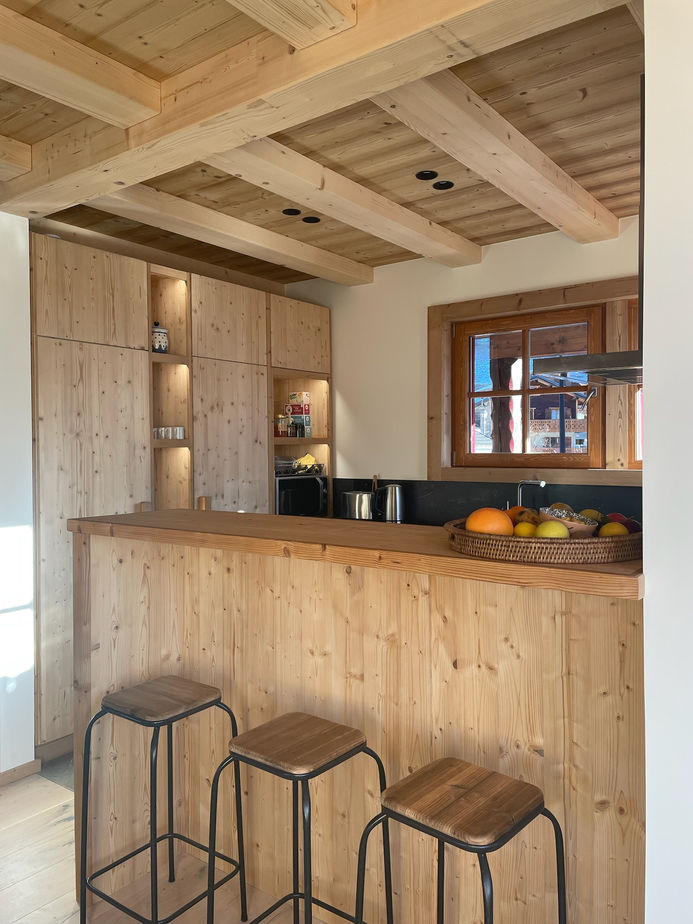 The use of wood for all the joinery and some partitions, the exposed beams on the ground floor, the stone-effect tiles in the bathrooms, contribute to creating a warm and harmonious space throughout the chalet.